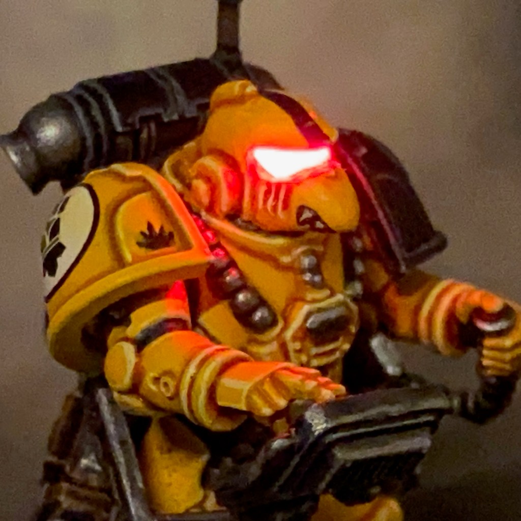 I did consider illuminating the control panel on the armature, as I have done with other similar devices here, here, and here, but decided against it for two reasons. Firstly, this effect works best when dramatically illuminating a bare head, rather than a helmet that is itself illuminated. Secondly, the Imperial Fists are a gaming army rather than display pieces, so I have to draw the line on time consuming LED effects somewhere!