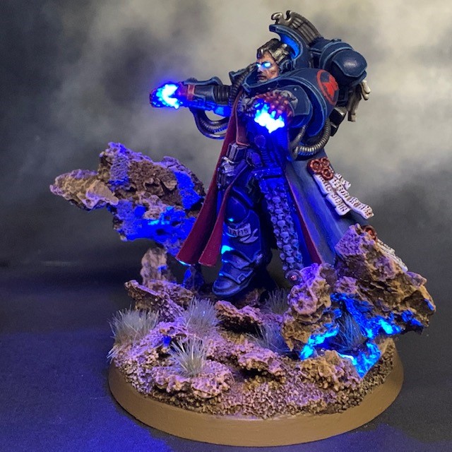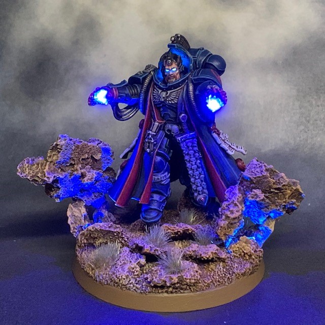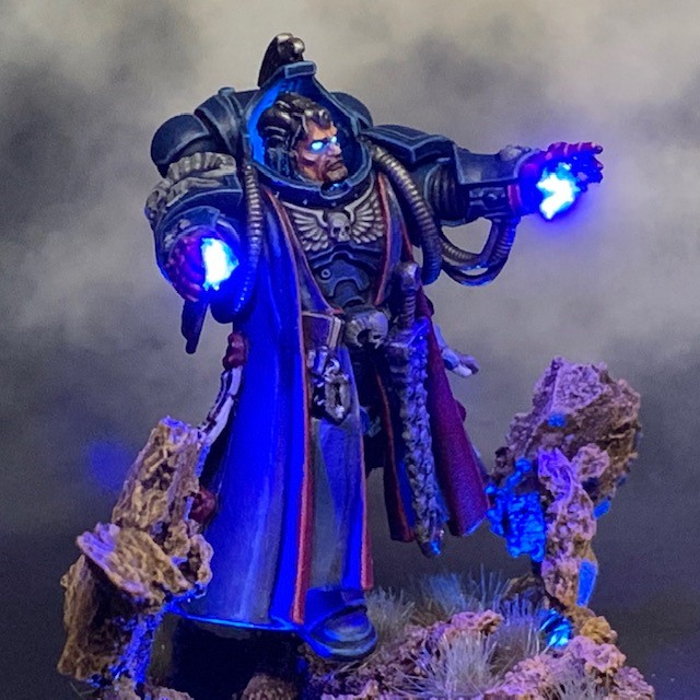 I remember seeing in White Dwarf a long time ago an article with a Dark Angels army where all the specialists had their armour painted in Dark Angels colours – either green or the bone of the Deathwing – and their robes painted in the colours of their specialism. I thought that looked great, so I decided to follow that approach here. The paint recipe I used on the robes uses Citadel paints: Macragge Blue base, Nuln Oil shade, then highlight up through Calgar Blue highlight and Fenrisian Grey. Otherwise I stuck to the pallet that I used for the rest of the army. It would have been very easy to get carried away painting the Librarian’s ‘bling’ but ultimately I felt the focus of the model should be the LED effects.