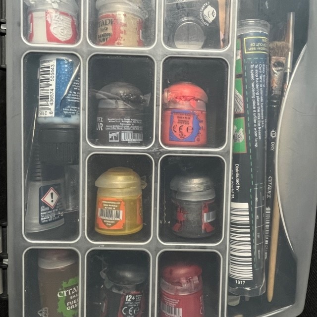 This past weekend I attended the Golden Demon painting contest at Warhammer World in Nottingham. In the pictures below you can see my entry packed and ready to go, along with my extensive emergency repair kit and plenty of spare batteries!