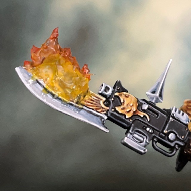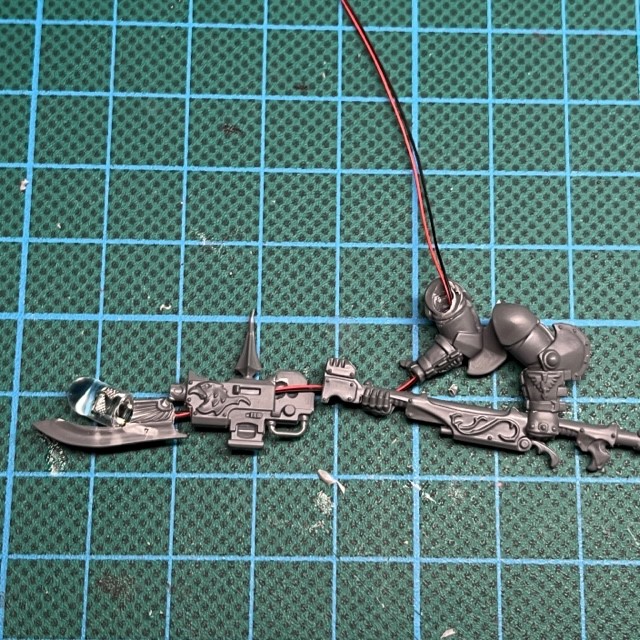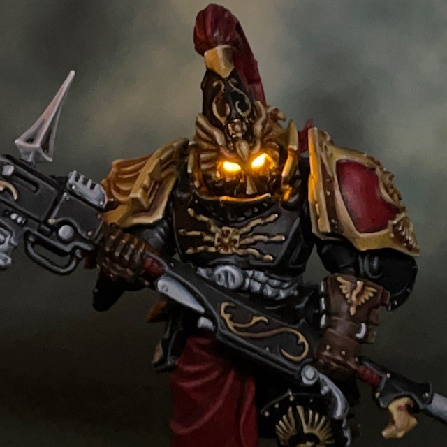 Next let’s look at the flickering fire on the blade. I wanted to show a guardian spear that was burning with golden flames of the Emperor’s wrath – the perfect weapon for a Shadowkeeper on the hunt! However, this concept broke two of my LED Design Philosophy “rules”. Rule number one is to “follow the art”, and I don’t actually recall any instances of Custodians with flaming weapons. Rule number four is to “consider the passage of time”, i.e. avoid a sense of motion with your LEDs if the model is not moving! As you can see in the video below, the flame-effect LED flickers to simulate the motion of flames. But despite these rules I had a strong image in my head for how I wanted this miniature to look, and as they say, rules are made to be broken!