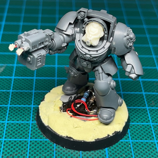 I decided to start with this particular Terminator as he was in a good firing pose, which made it easy to add some LED muzzle flares. I used the techniques detailed in my LED Muzzle Flare Tutorial, the only difference being that there are two muzzles on a storm bolter! This meant two Yellow/Amber 0805 Chip LED (3V) connected in parallel. For the helmet eye lenses I used a TruOpto OSPG7331A-KL 1.8mm Green LED. Due to the position of the Terminator’s head in respect to its body, I found it easier to insert the helmet LED from the rear of the helmet, rather than underneath as I normally do.