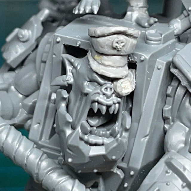 It was tempting to sculpt Shootit the grot some fancy clothes since he is obviously the boss’s favourite, but in the end, I decided to keep him fairly drab and utilitarian, so that he didn’t draw focus. I did give him a gold cap badge though, just to show he is a bit more important than the average grot.