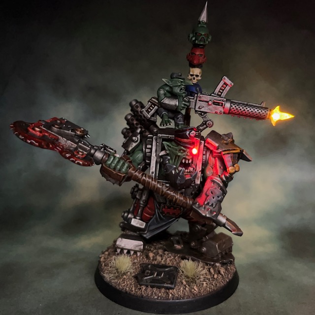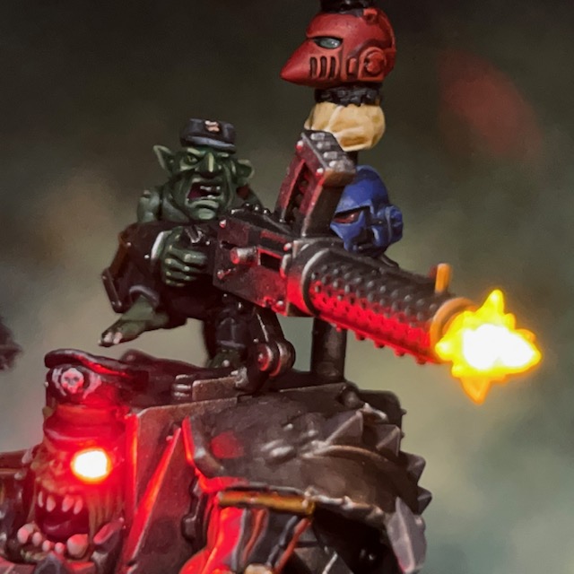 When I picked up the Ork Warboss in Mega Armour, the LED potential was clear. I knew I had to get that big shoota firing, and I had to do a cool bionic eye to go with the “Yarrork” theme I had planned. The LED techniques used on this model can be found in my LED Muzzle Flare Tutorial. The only difference is for the bionic eye I used a single Red 0805 Chip LED (3V) and 100 ohm resistor from Small Scale Lights, rather than the TruOpto 1.8mm LED mentioned in the tutorial. This LED is sculpted into a bionic eye mounted on the Warboss’s face, rather than being embedded in a resin head.