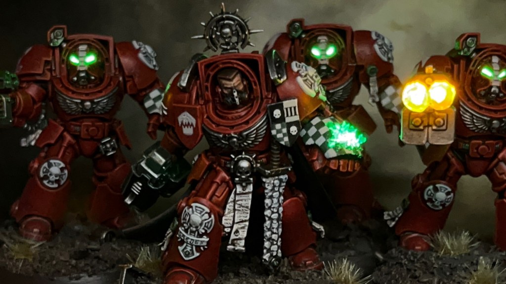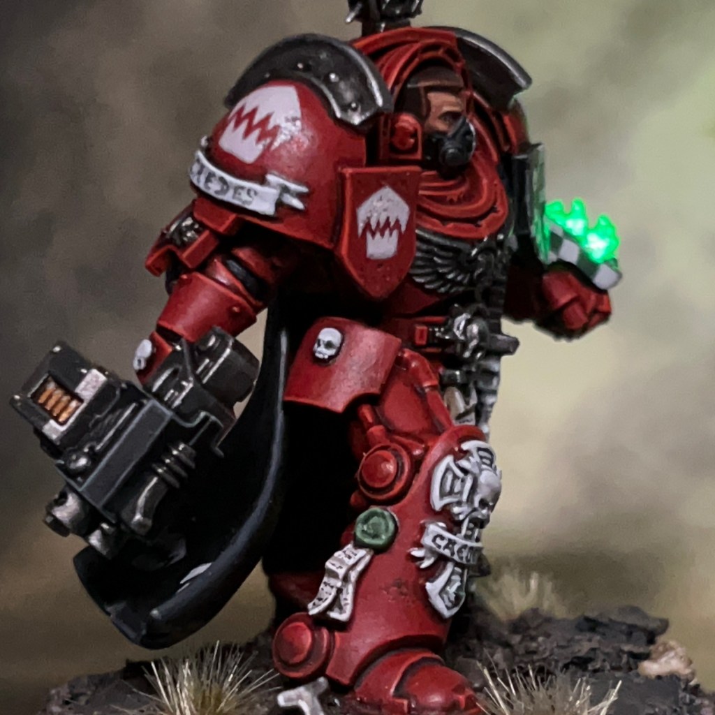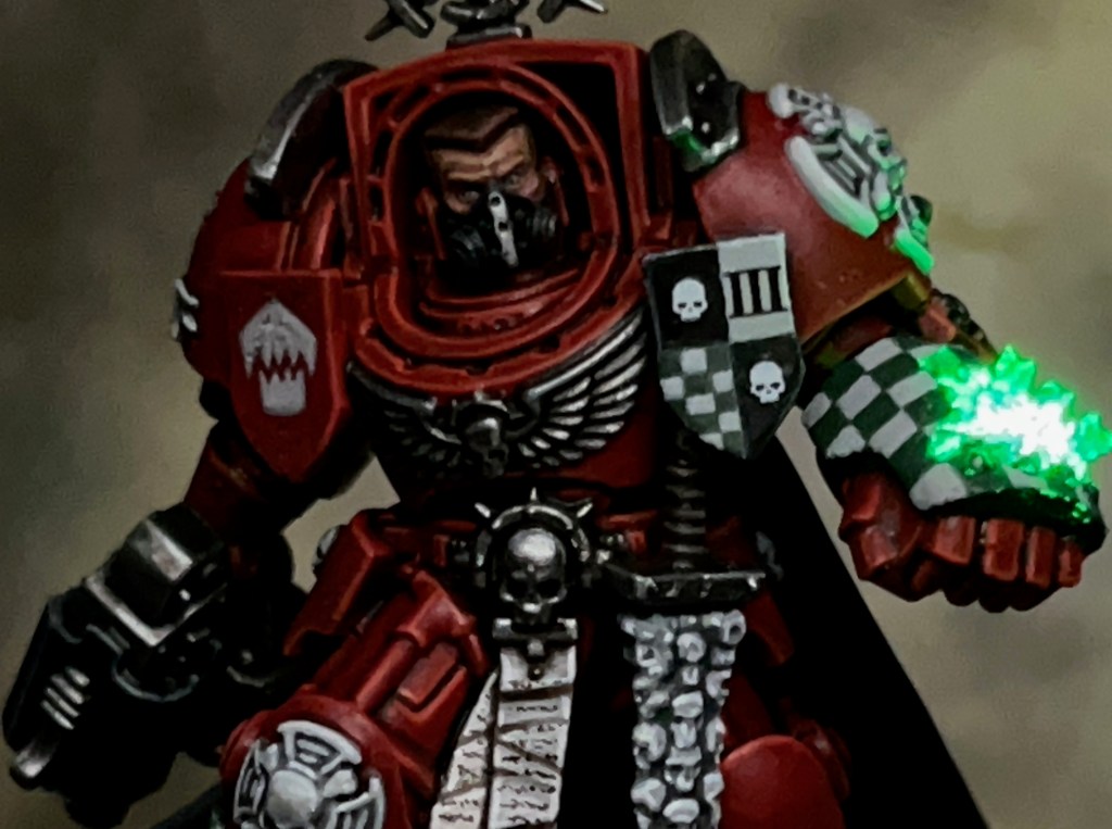 At this point in the Flesh Eaters project my colour schemes are well established. If you’d like to know what paints I used with this miniature, then you can find my paint recipes for red armour, Terminator iconography, Space Marine pale skin, and freehand checks in the linked articles.