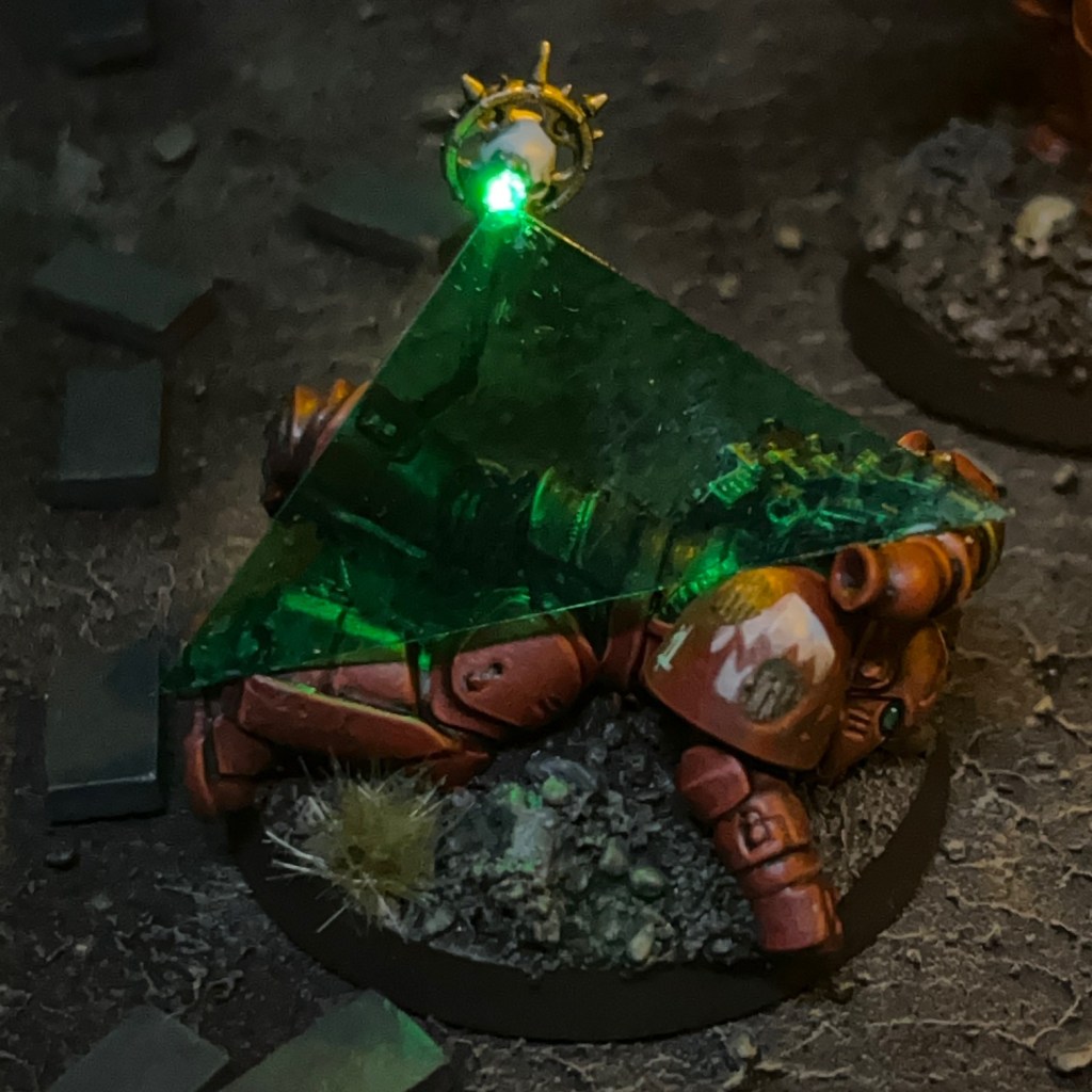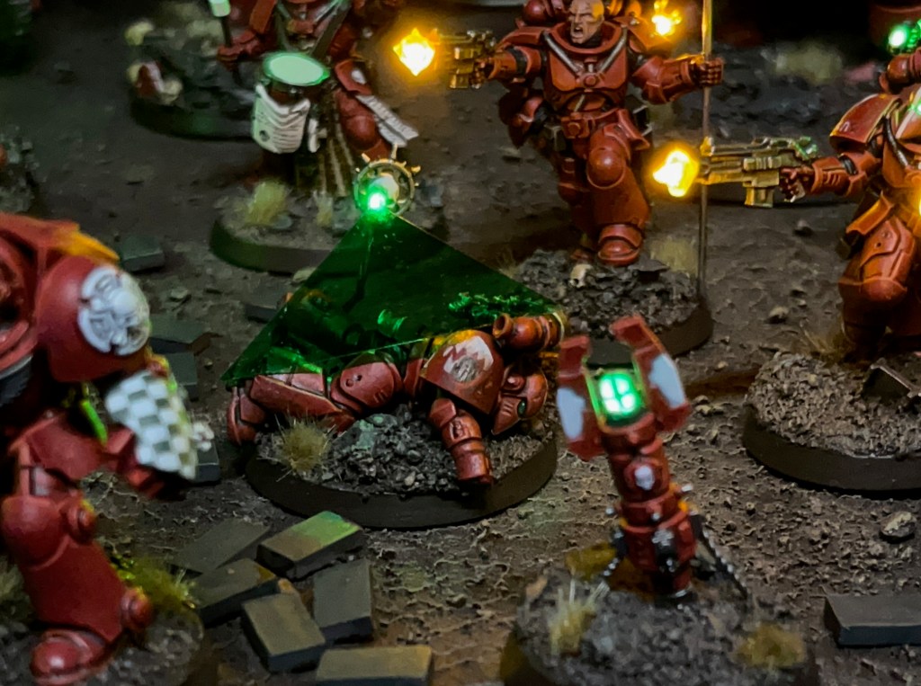 The Flesh Eaters casualty on the right of the board is intended to represent the victim of the sniper – but he did at least manage to activate the teleport homer before he fell! The casualty is mounted on a 40mm base and will eventually be used as an objective marker. If you look closely, there is a ‘1’ on his pauldron, for missions where numbered objectives are relevant. The servo skull with its LED eye was made in exactly the same way as Brother Nikko’s servo skull. I glued a triangle of translucent green plastic to the LED eye to really emphasise the scanning effect.