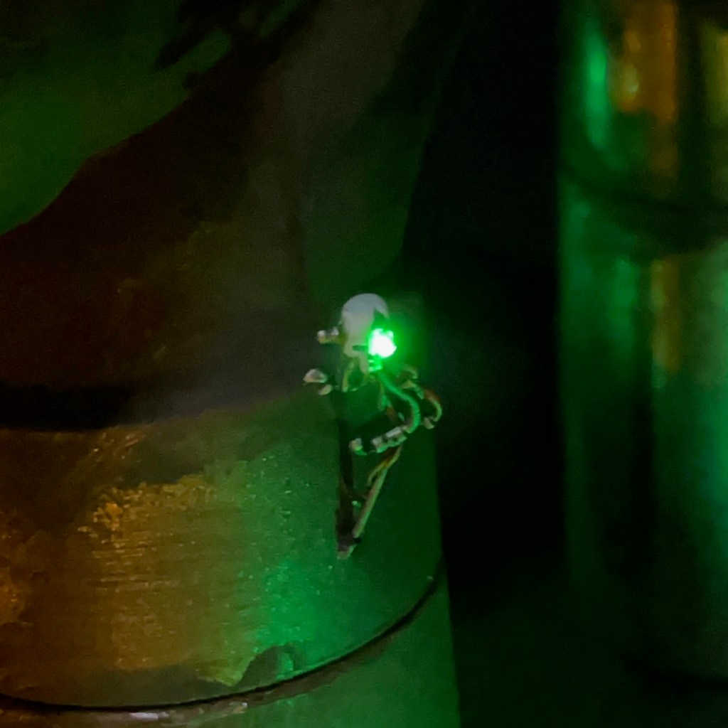 The smoke was achieved with an ‘Ultrasonic Mist Maker Atomizer DIY kit’ purchased from eBay, and a small reservoir of water at the bottom of one of the vertical pipe sections. The ultrasonic atomizer, as well as the miniatures described in the next section, were all controlled by batteries hidden under the board.