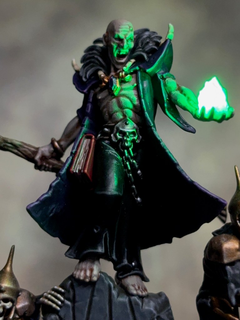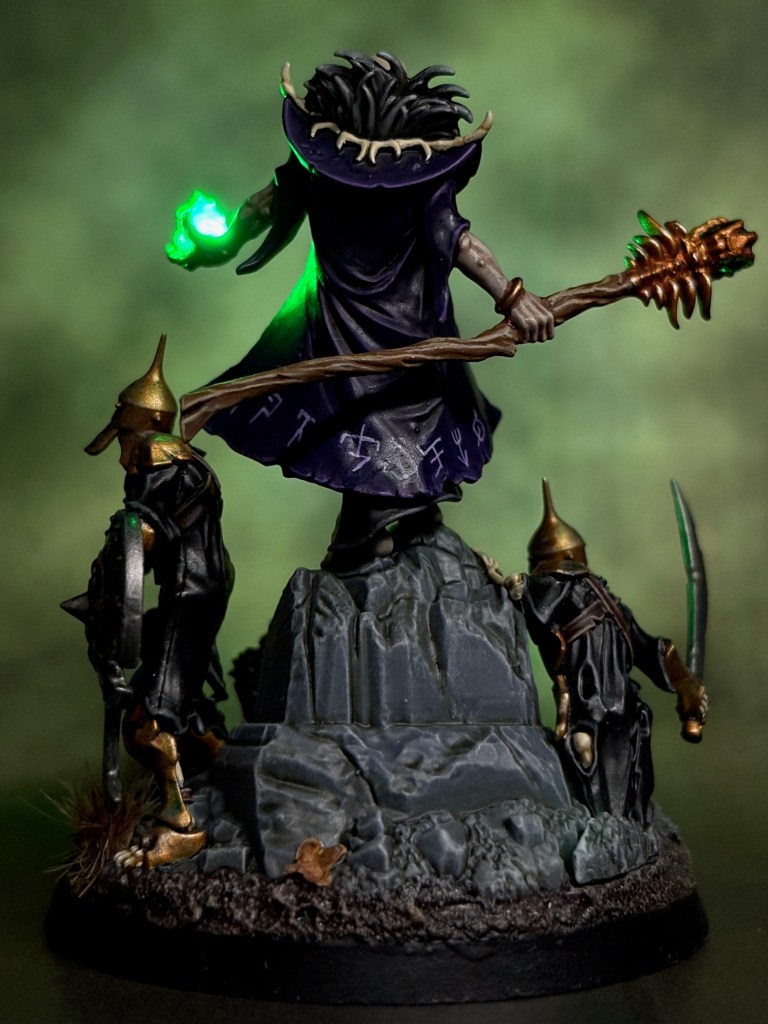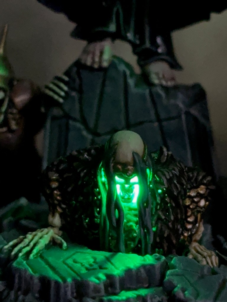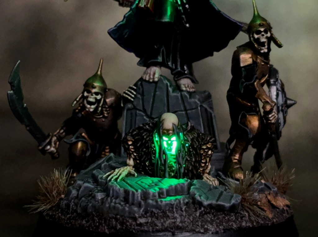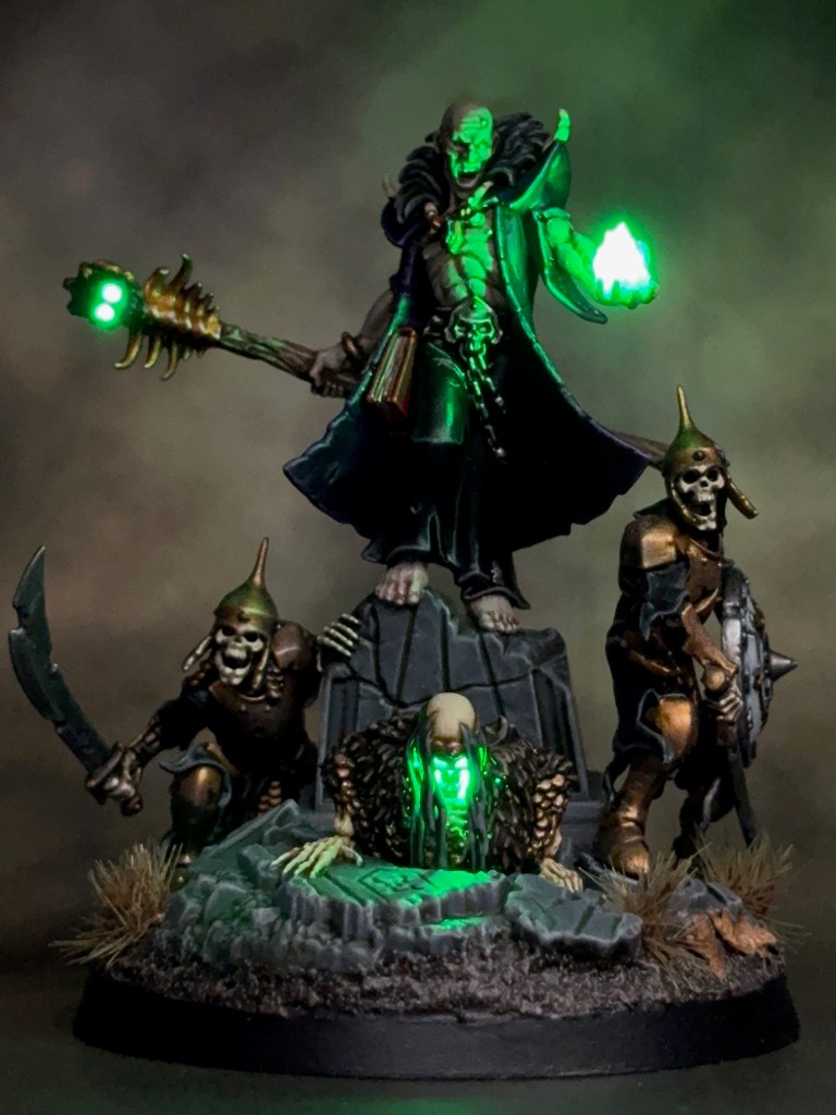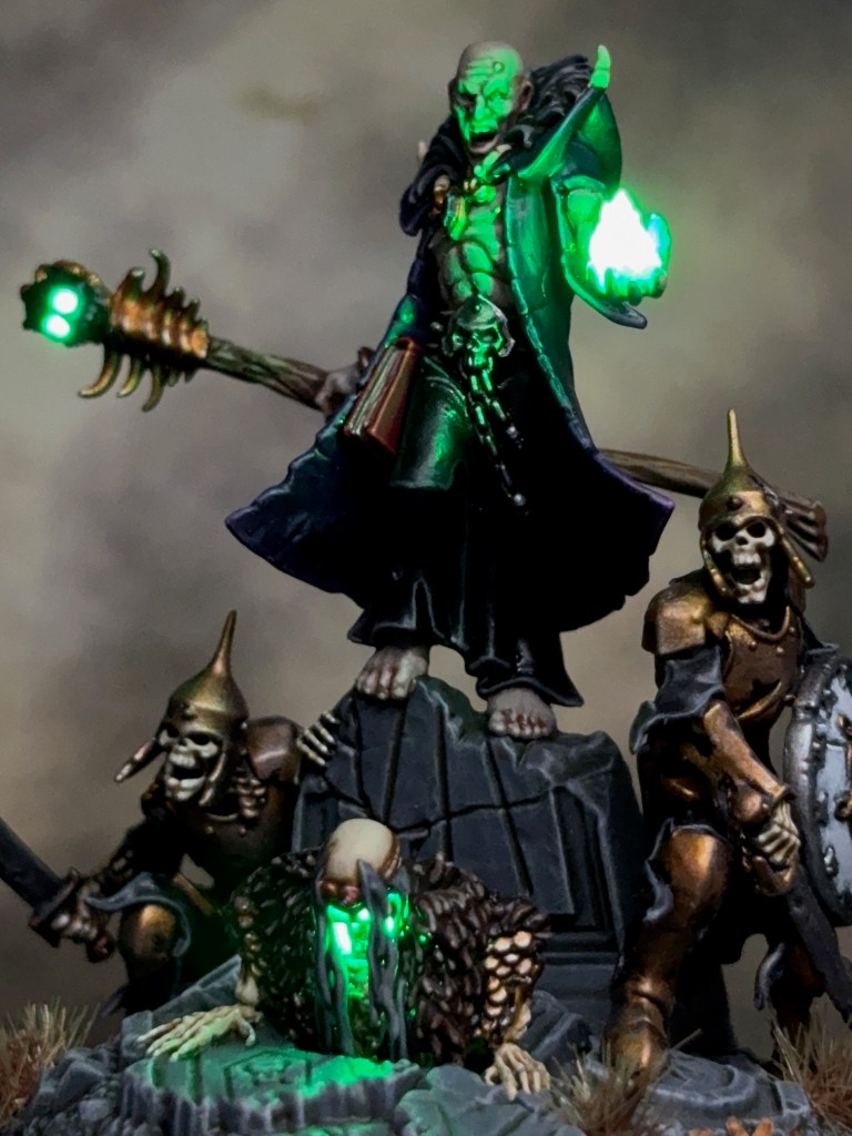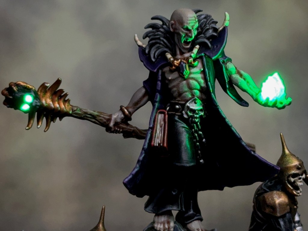 I’ve been flirting with the idea of building some variety of Warhammer Undead army for many years now. So when the Warhammer+ miniatures were announced for this year, the Necromancer really leapt out at me as the clear choice. The stock miniature doesn’t feature any obvious light sources, so I had some creative freedom on which parts I chose to illuminate. I considered a number of ideas; candles, lanterns, glowing necklace gems, burning green eyes on the Necromancer, and even an unholy glow projected upwards from the open grave.