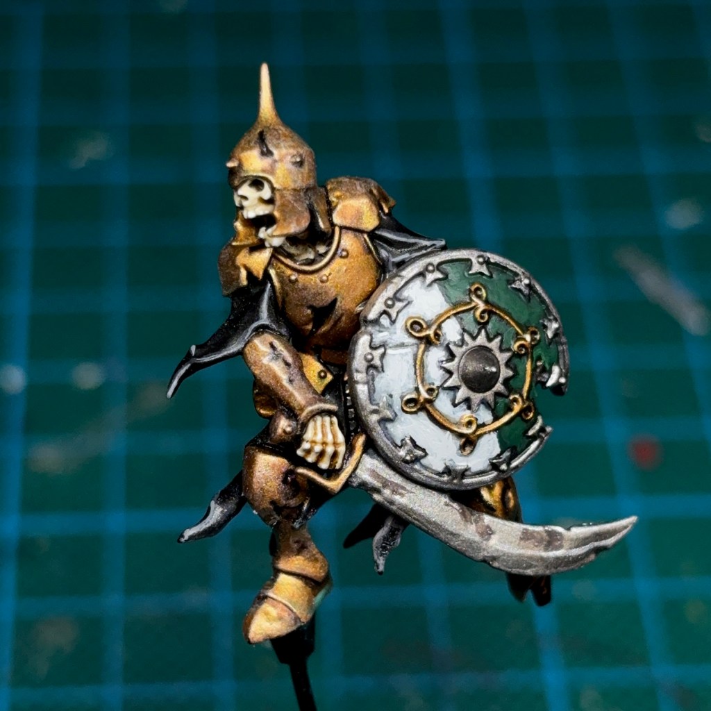 When deciding on the paint scheme, I decided to stay reasonably close to the box art as I didn’t have an existing army colour palette to match. The purple and black robes were also very evocative of the classic Warhammer Fantasy Necromancer. But I did add a few small twists of my own. In my head canon this is Wilhelm Lichtenfels, a Necromancer I created for a short lived narrative campaign ‘Shadow Over Steepacre’, that I played with with my gaming group back when Age of Sigmar was first released. The Steepacre town heraldry was white and green, which is reproduced in the skeleton’s shield. I’ve made previous versions of Wilhelm, and each version becomes a little more corrupted (and a little more buff).