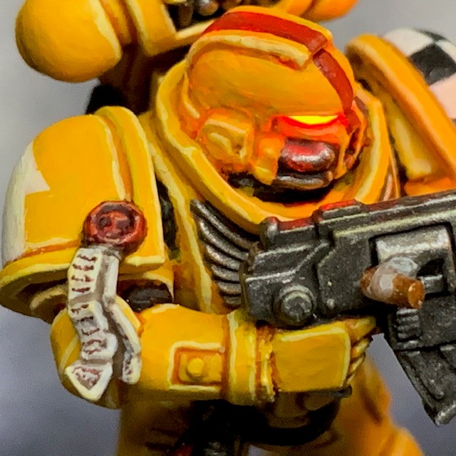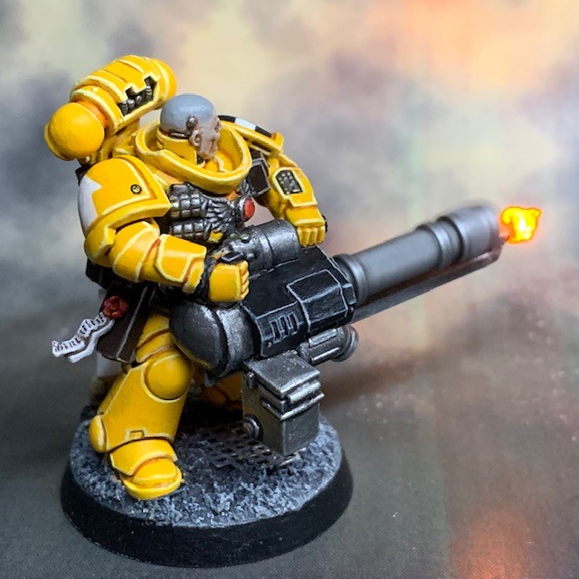 When designing this Marine, my question to myself was “how can I make one of the team’s “filler” tactical marines with bolter interesting?”. In the end I hit upon the idea of loosely copying this classic Mark Gibbons art. I haven’t copied it exactly – for one the marine in the art is a Blood Angel – but I hope I’ve captured the feel, both of the art and of that era of Games Workshop history. Of course Brother Quartus has grown on me over the building and painting process so now I think I might promote him to sniper specialist in the kill team.