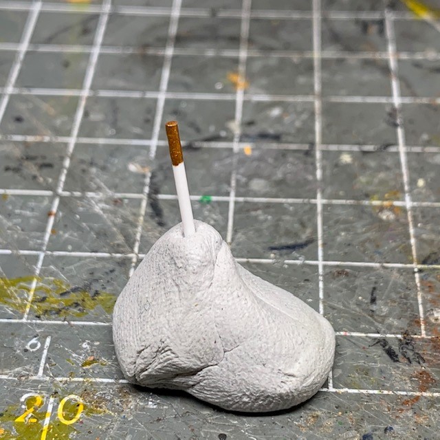 I started with a 1mm diameter plastic rod, painted the end in Retributor Armour, and then cut off a 2mm length to form the ejected bolt shell casing.