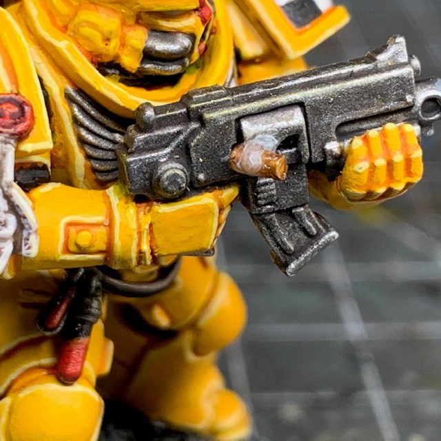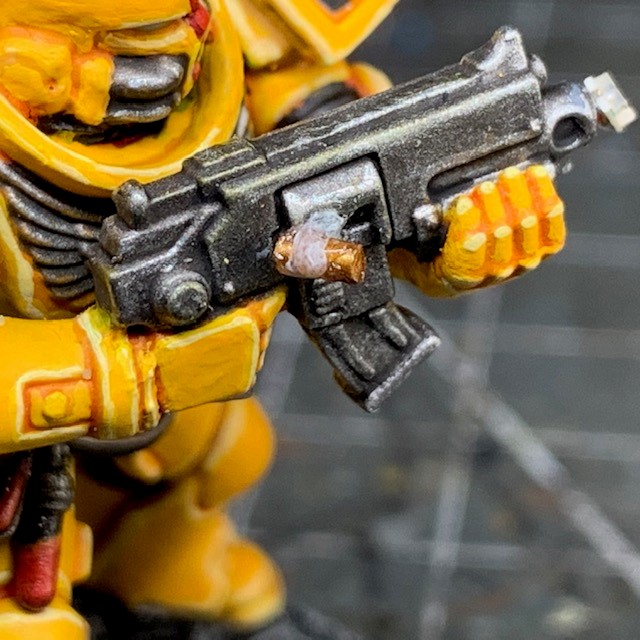 For the LED effects I simply just followed the steps in my own LED Muzzle Flare tutorial to the letter, using the exact LEDs and components listed there. My Lamenters paint recipe can be found in this post if anyone is interested in how the yellow is achieved. As for the mid-ejection bolt shell casing, I think that’s worth talking through as this is a new technique that I was playing around with for this model.