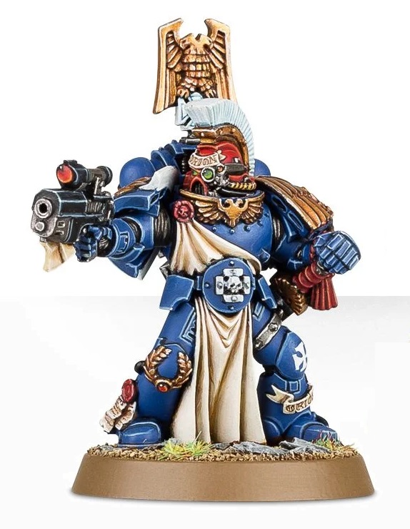For this model I was strongly influenced by the classic metal sergeant from the old Space Marine command squad box (sorry, this was the best reference image I could find). I didn’t set out to copy it exactly, just to capture the general energy and atmosphere of the model. Brother Ardito is made from the ‘Easy to Build’ Primaris Marine with auspex, although as you can see he’s been heavily altered to change the pose, details and make it appear that he’s wearing MkVII power armour, in keeping with the Badab-era setting.