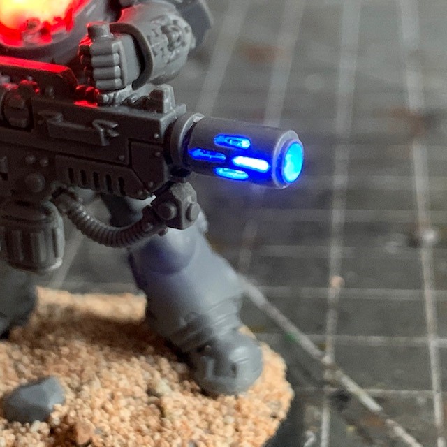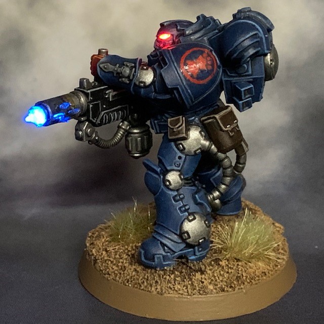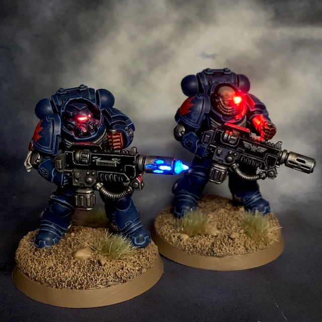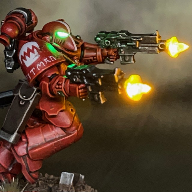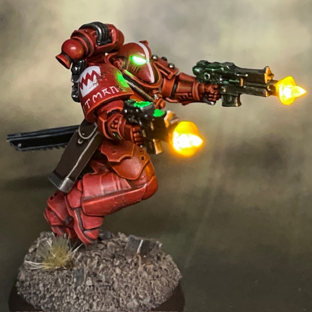 I’m back again with the next addition to my Flesh Eaters Space Marines project. Brother Castiar is the fourth member of my second Assault Intercessor squad, along with Brother Pitman, Brother Oram, and Sergeant Byrne. As well as the usual LED muzzle flare and bullet impact effects, Castiar also has a choice between a bare head or helmet that can be easily swapped during a game.