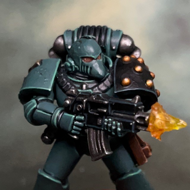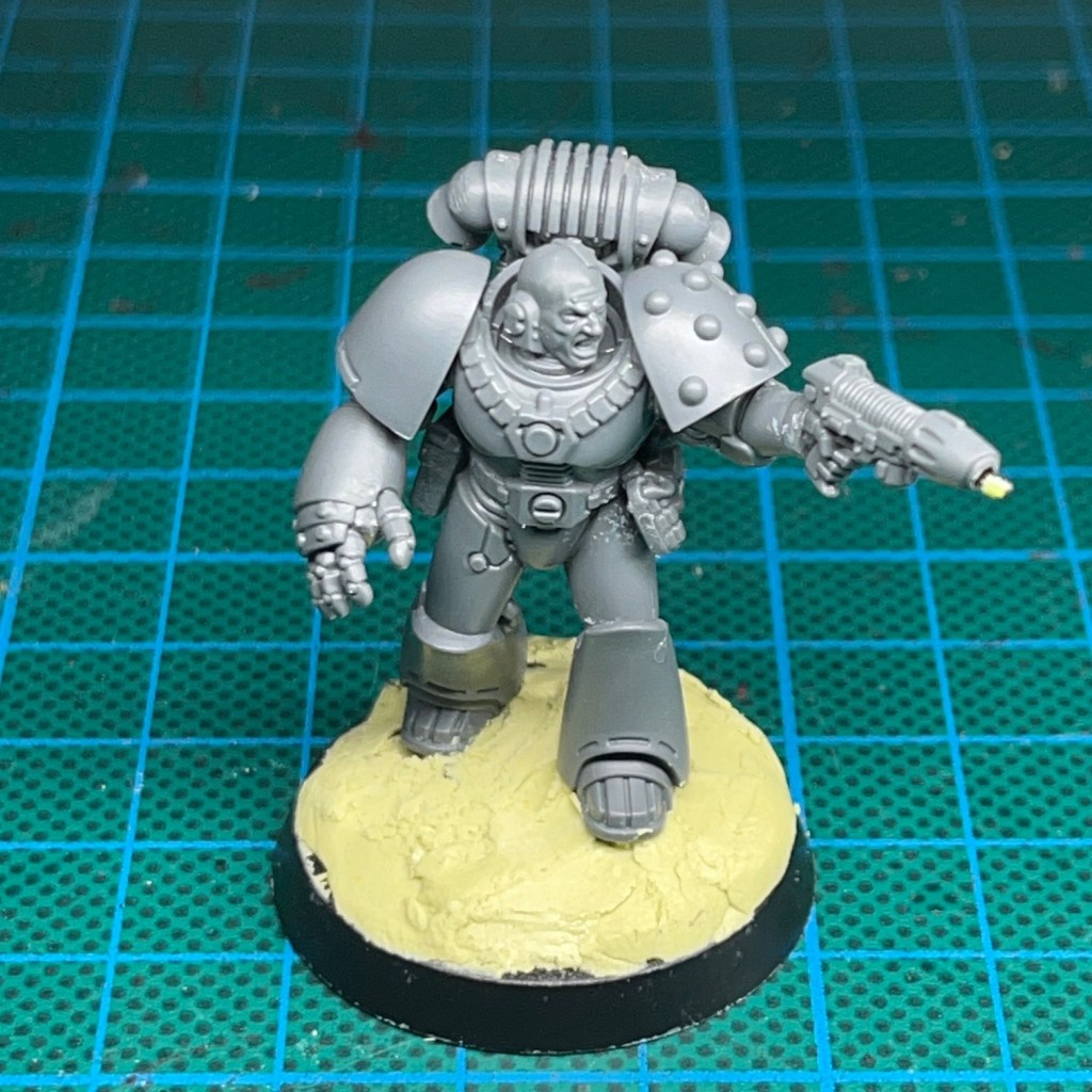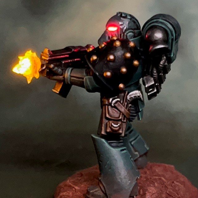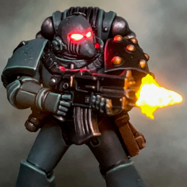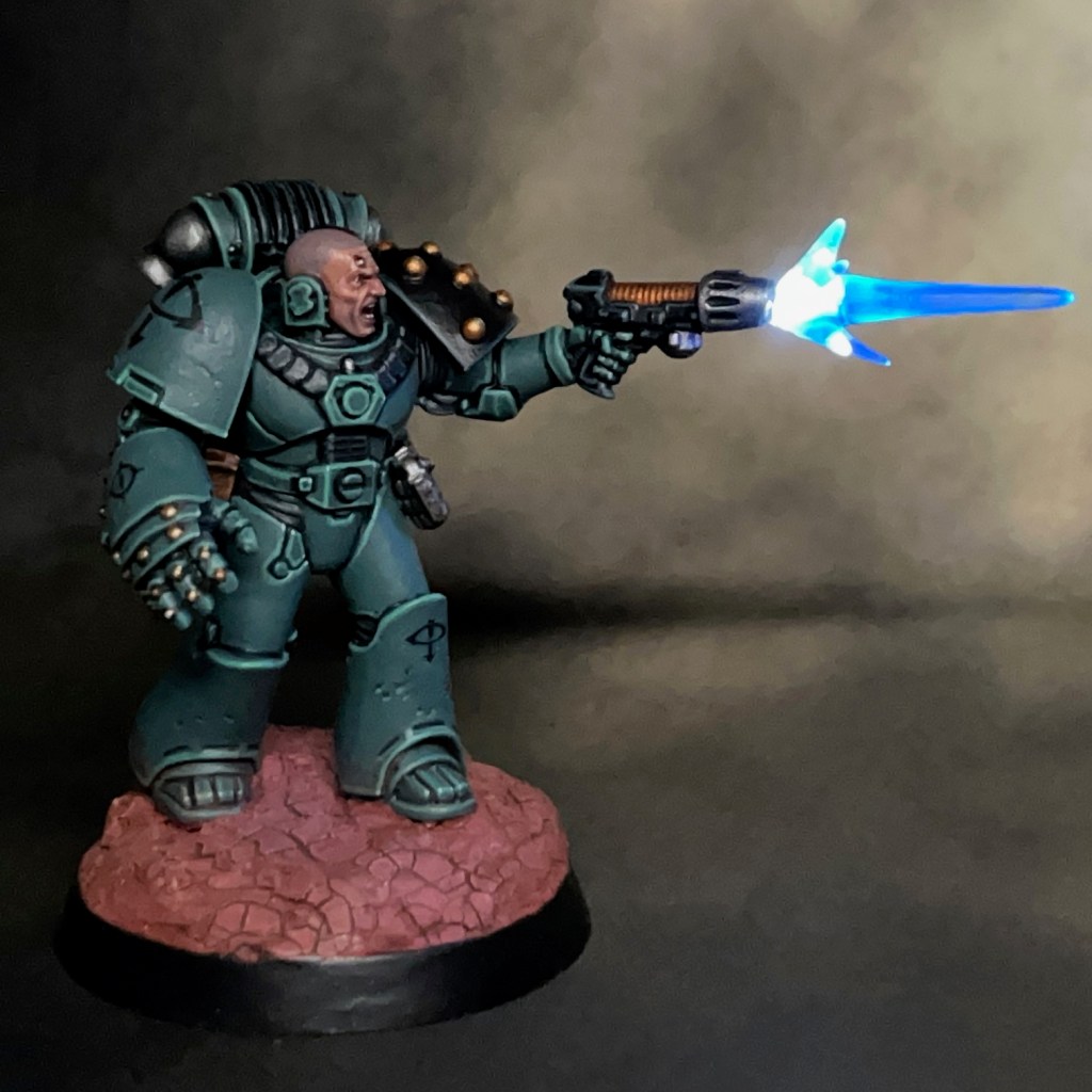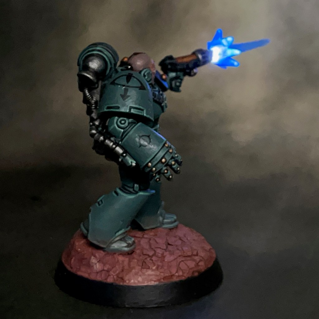 The equipment and pose of the miniature were influenced by sergeant on the Legion MKVI Tactical Squad box art, shown above. I swapped the mask for a bare head as a shouting or grimacing face combined with an LED muzzle flare really helps to sell the ‘mid-action’ pose.