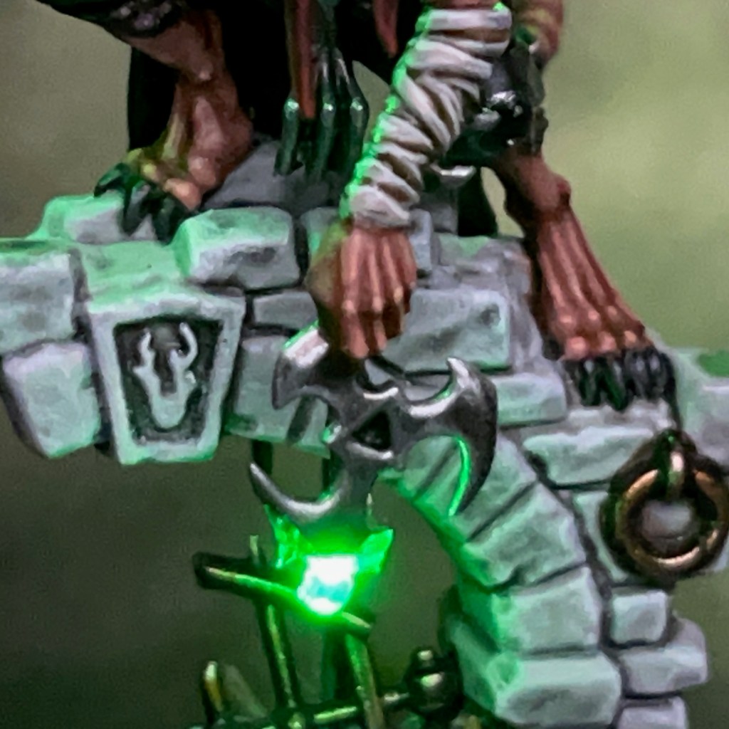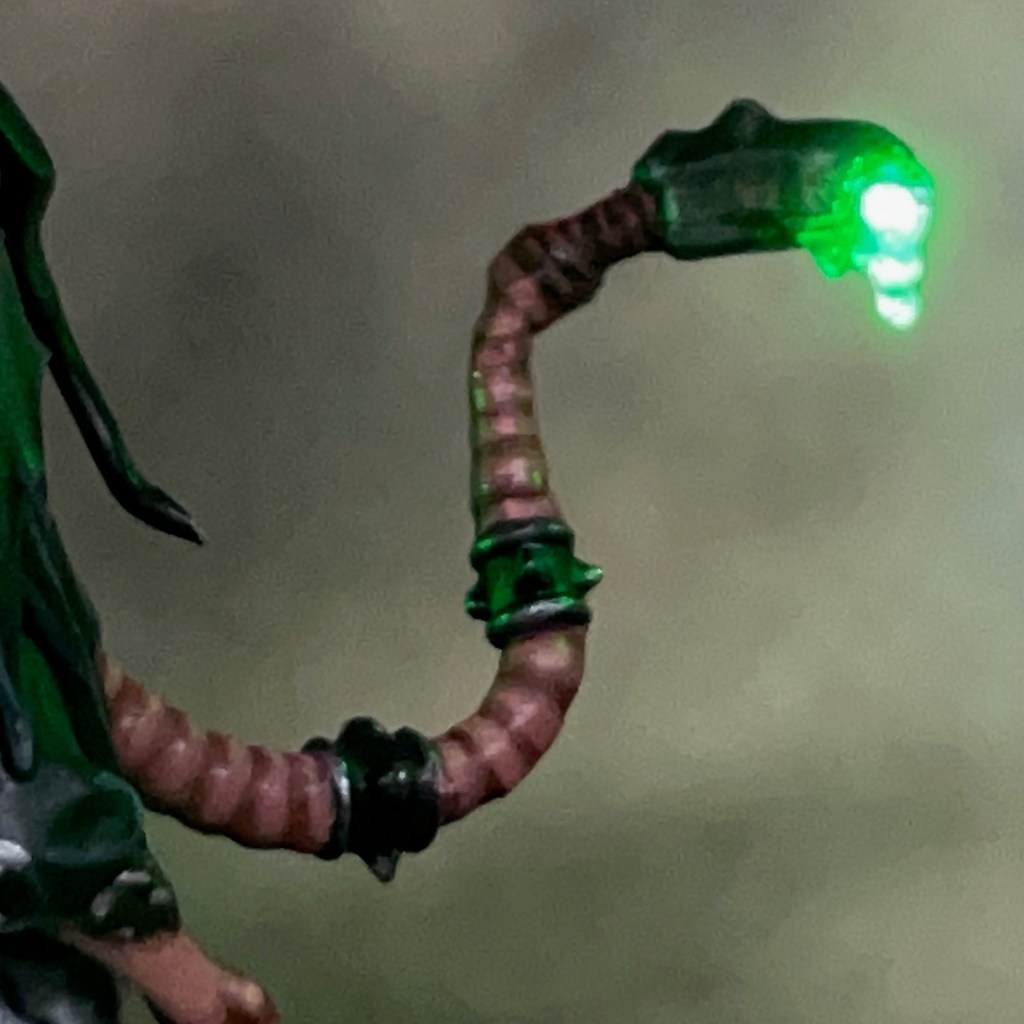 The drips of warpstone poison were sculpted in layers from Water Splash Effect Gel (just like the muzzle flares in my Simple LED Muzzle Flare Tutorial). I then painted them with a thinned down coat of Ork Blood from Green Stuff World, just so they still looked good even when the LEDs were switched off. You can see these stages below