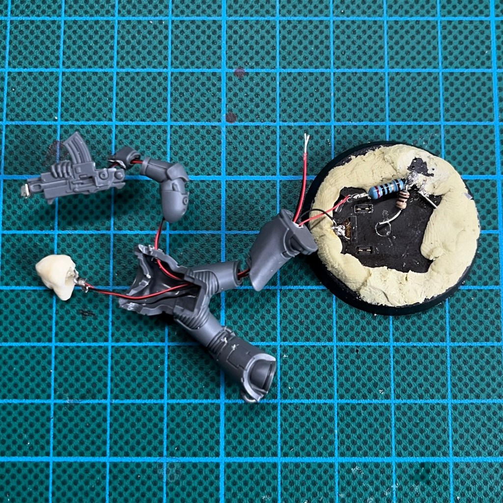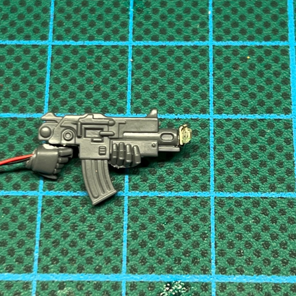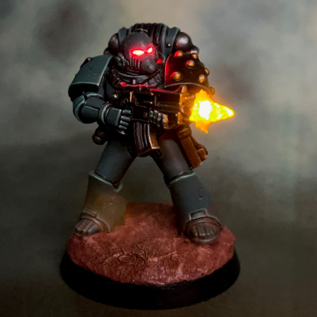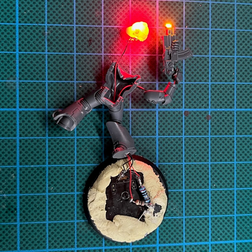 This is my tutorial for LED effect gun muzzle flares combined with LED eyes. The photos show this technique applied to a Horus Heresy Marine with bolt gun, but it can equally be applied to any other weapons that’s likely to have a muzzle flare. This is the updated February 2023 version of this tutorial. If you would like to read the original version from June 2019, it is archived here. If you do not wish to include LED eyes in your miniature and only want the muzzle flare, you may want to try my Simple LED Muzzle Flare tutorial instead.