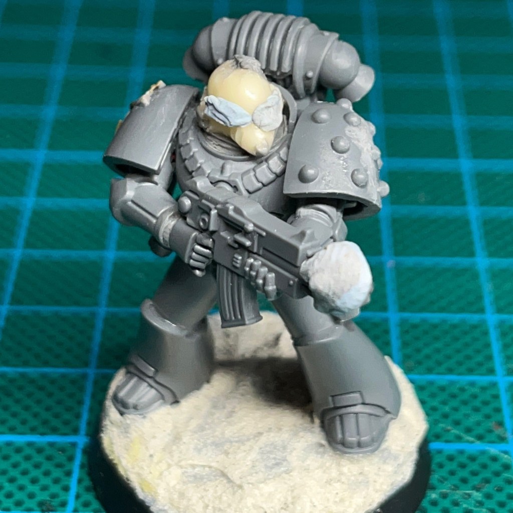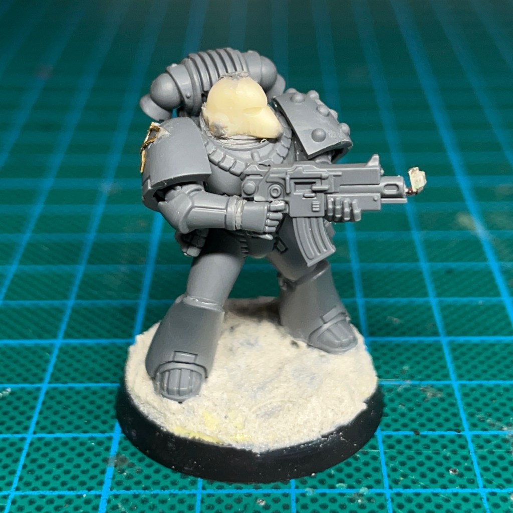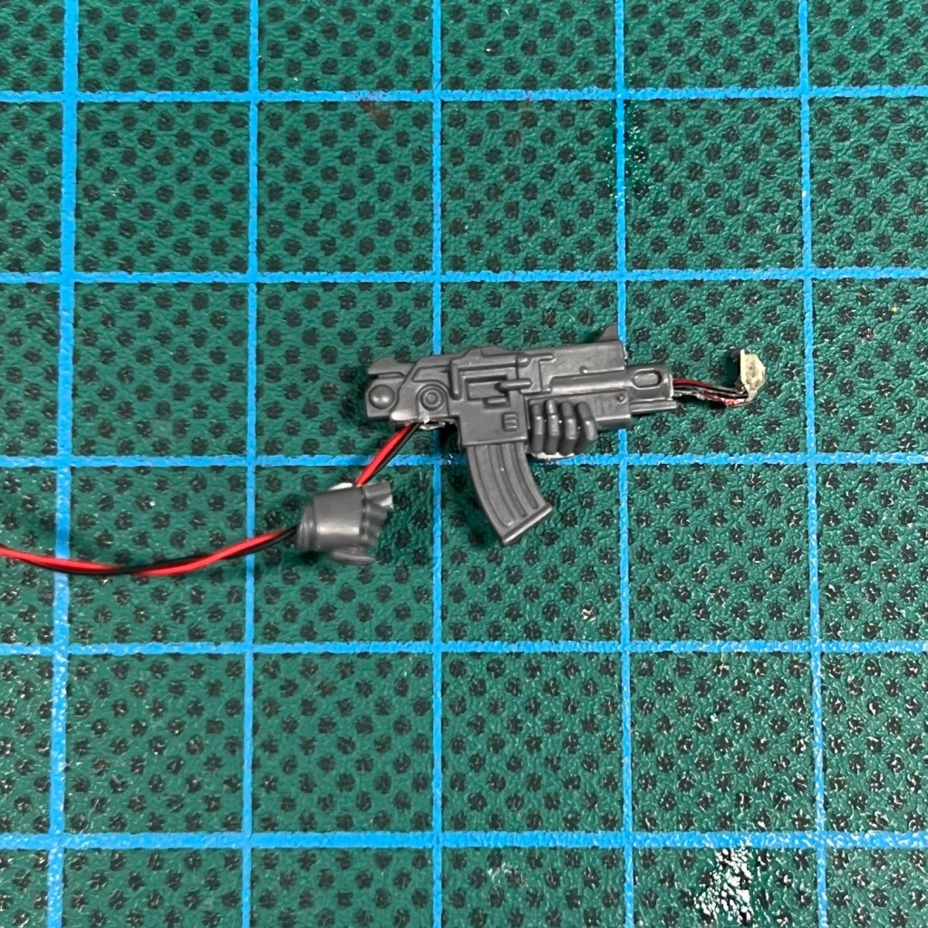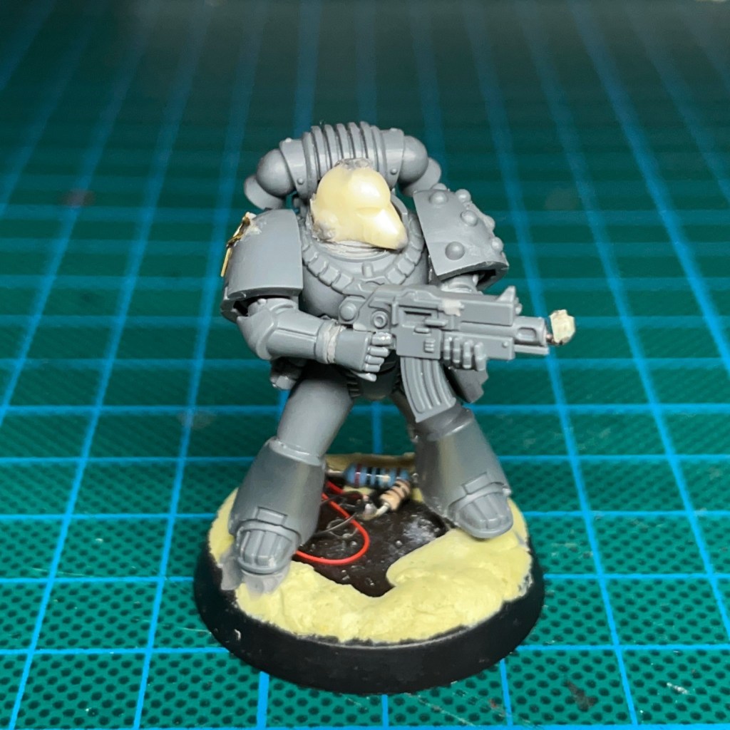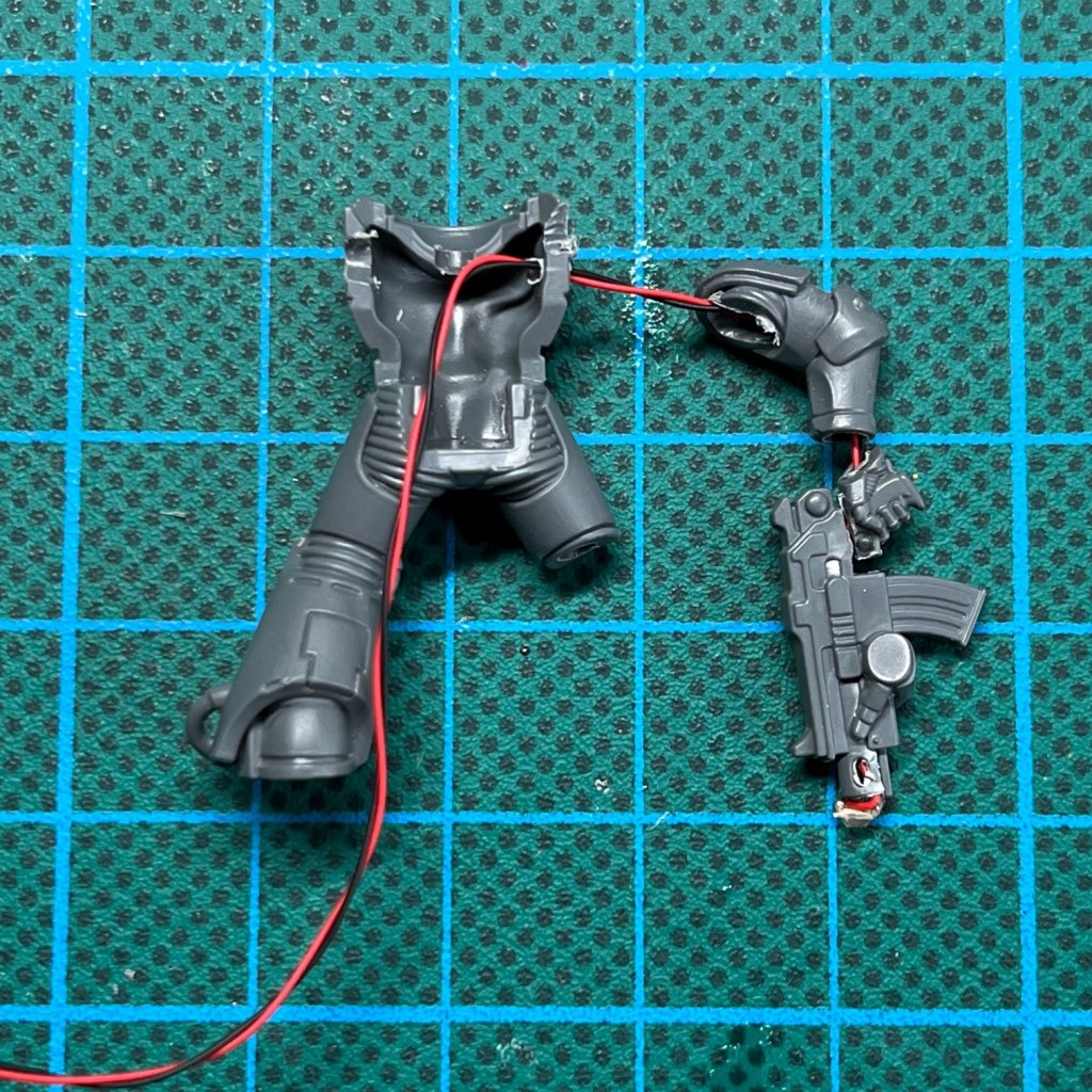 This is my tutorial for LED effect gun muzzle flares combined with LED eyes. The photos show this technique applied to a Horus Heresy Marine with bolt gun, but it can equally be applied to any other weapons that’s likely to have a muzzle flare. This is the updated February 2023 version of this tutorial. If you would like to read the original version from June 2019, it is archived here. If you do not wish to include LED eyes in your miniature and only want the muzzle flare, you may want to try my Simple LED Muzzle Flare tutorial instead.