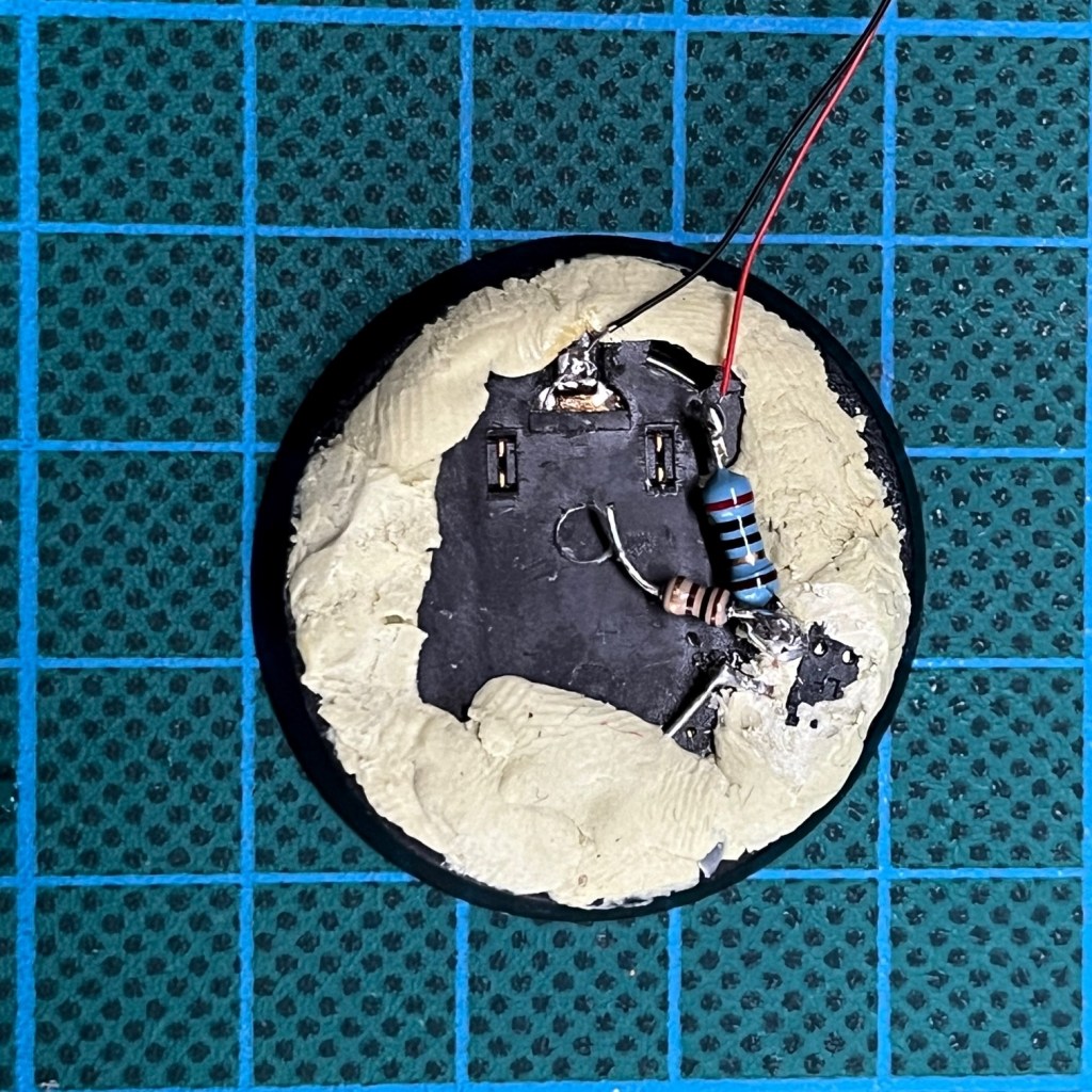 Once the putty and/or glue applied in the previous stage has dried, you can now hide the battery holder and any spare slack wire under a layer of putty or filler. Be sure to not get milliput on the battery itself, and to leave the sliding part of the switch exposed so you can still operate it. Once the putty covering the battery holder is dry, you can add texture to the base if you wish (e.g. PVA and sand).
