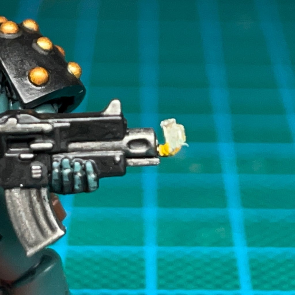 The next stage is to start work on the muzzle flare effect. I prefer to do this simultaneously alongside the painting process for the rest of the model. If you can see any of the red or black wires on the back of the chip, start by painting these yellow. This means they will be less noticable in the finished muzzle flare.