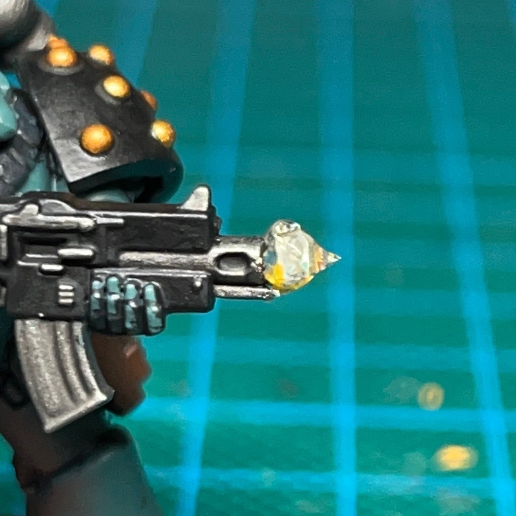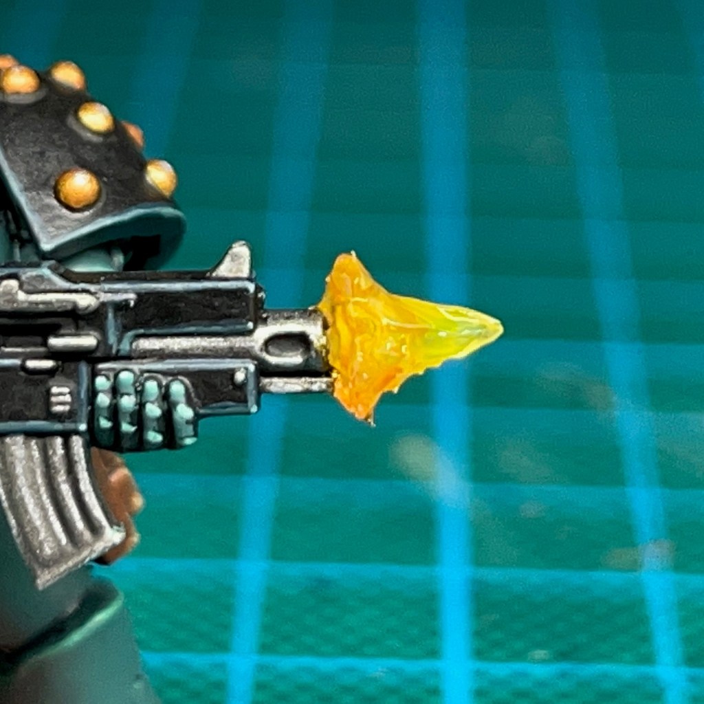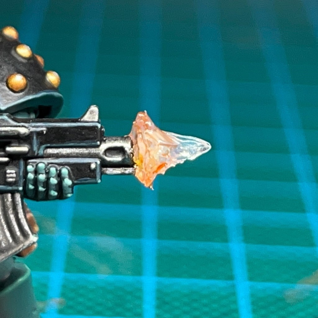 Once you are happy with the shape and the gel has completely dried, you can paint the muzzle flare. You only need to apply a light glaze – this will not inhibit the light of the LED and will also make the model look good when the LED is switched off. First apply a shade of Citadel Fuegan Orange to the widest area of the muzzle flare, closest to the bolt gun (left-hand image below). Once this had dried I applied a layer of Citadel Imperial Fist Contrast thinned down with water to a glaze consistency (right-hand image).
