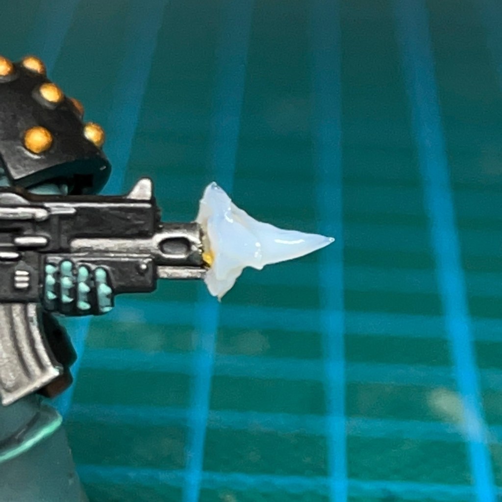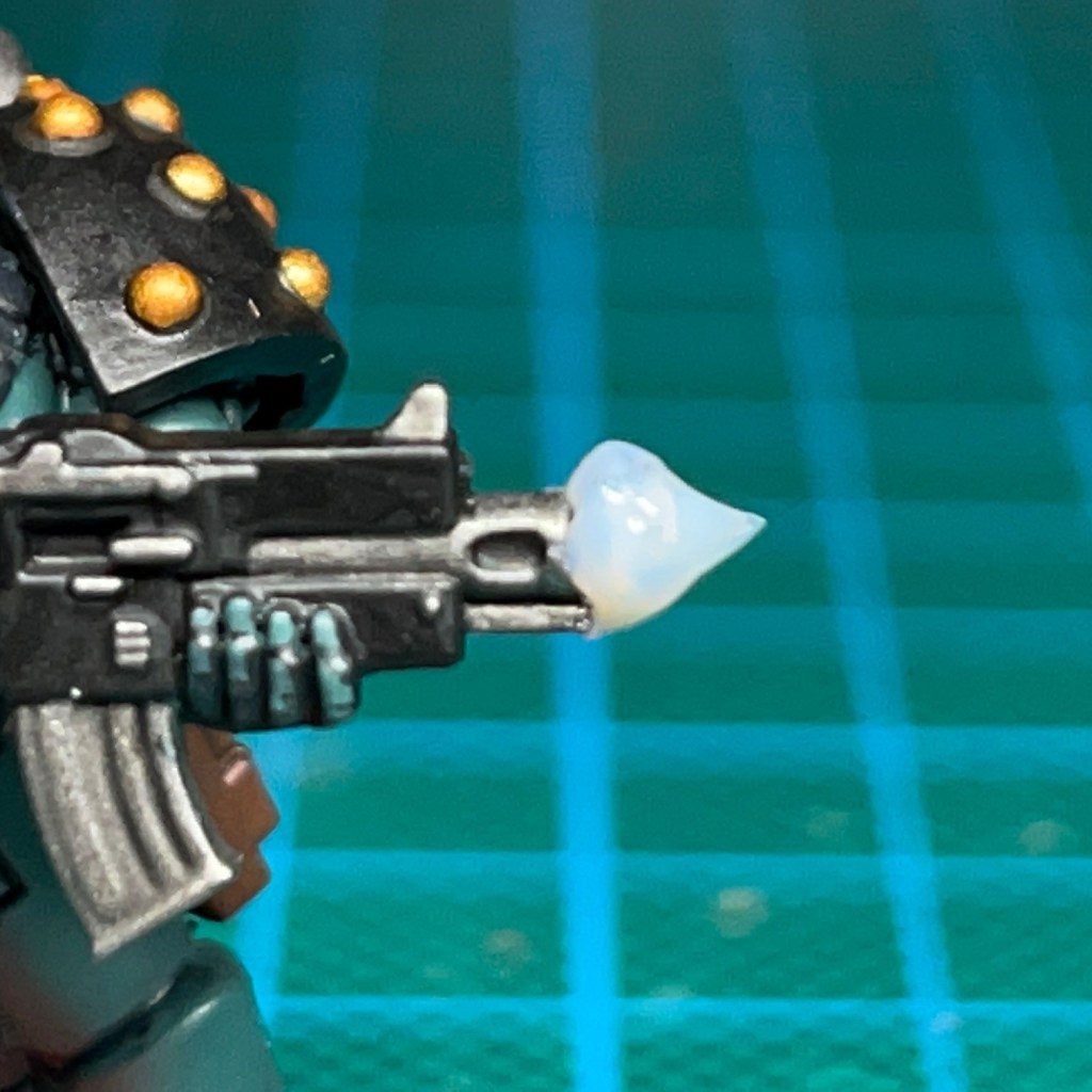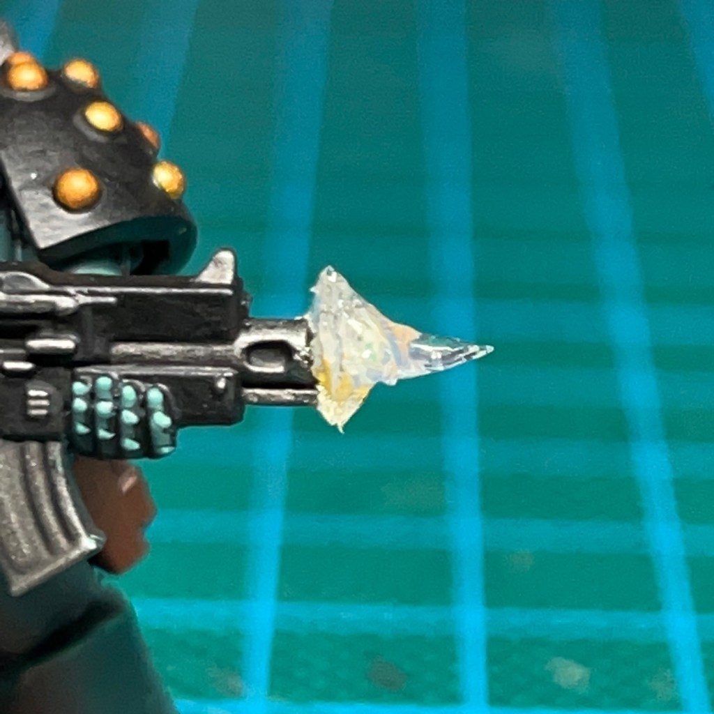 Once you are happy with the shape and the gel has completely dried, you can paint the muzzle flare. You only need to apply a light glaze – this will not inhibit the light of the LED and will also make the model look good when the LED is switched off. First apply a shade of Citadel Fuegan Orange to the widest area of the muzzle flare, closest to the bolt gun (left-hand image below). Once this had dried I applied a layer of Citadel Imperial Fist Contrast thinned down with water to a glaze consistency (right-hand image).